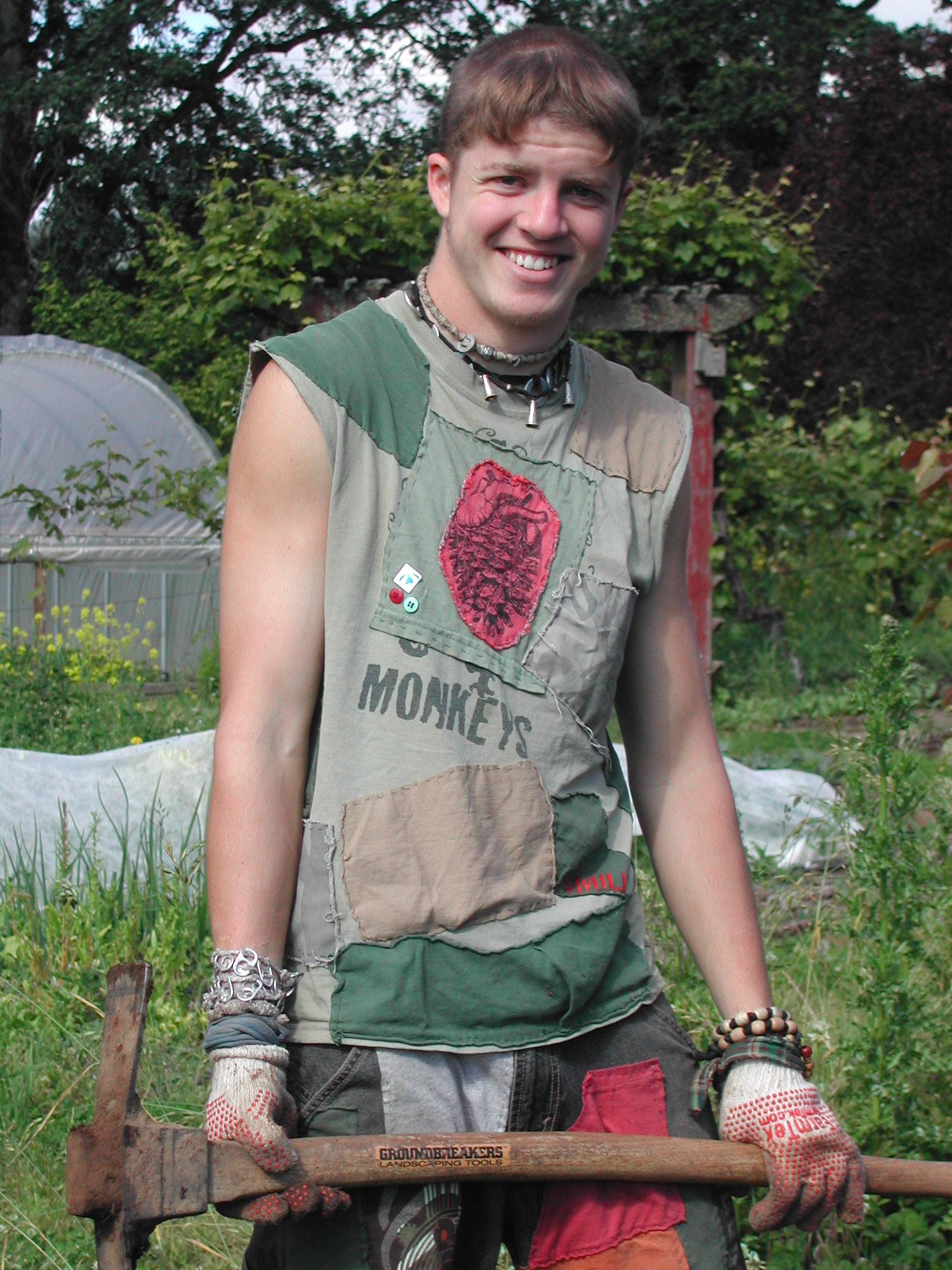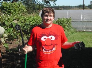 Just about three weeks ago, we got a call from our nephew, Jonas, who was doing some hitchhiking around the western states. He was in Portland and wondering if he could take us up on our offer to visit and help out. Jonas is an artist, and since he arrived while it was still raining, he made some killer name tags for the new delivery bags. Of course, once the rain stopped, we put him to work outside. Steven’s dad offered to spade our front lawn, turning over the grass so we could till it up for a new blueberry bed. No reason to turn that offer down. Jonas helped out by digging out some shrubs around the old lawn.