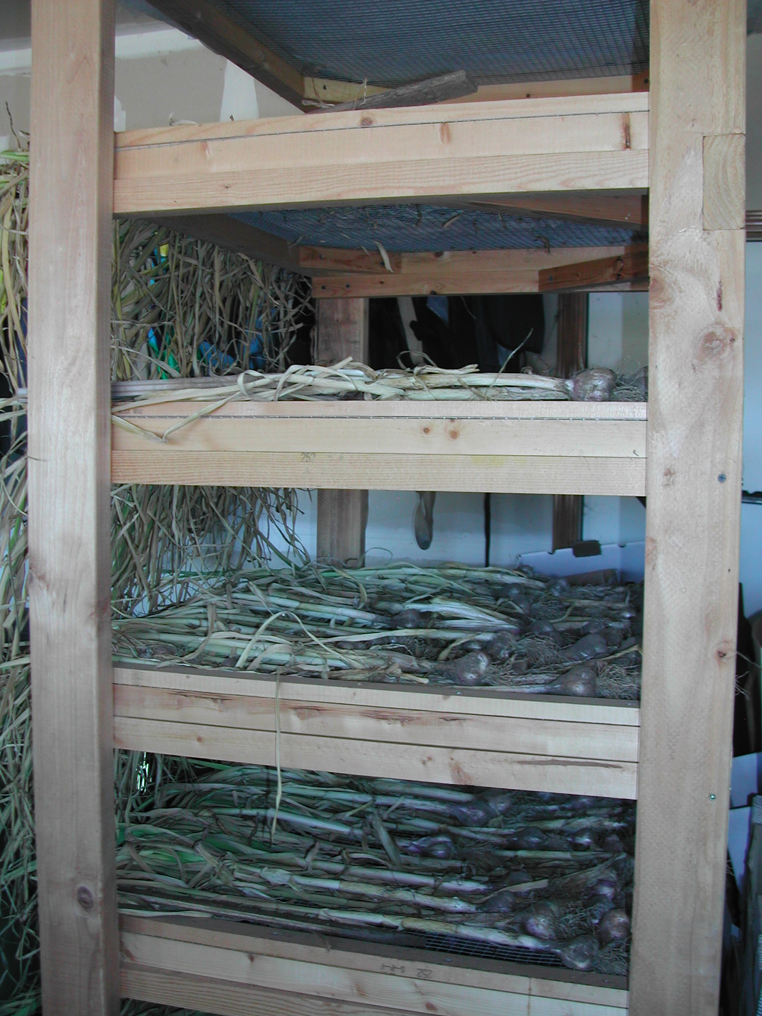Weeding has been the major task of late, along with clearing out some beds for a second round of planting. All the peas and fava beans are out now (other things that finished earlier have been out for some time, those beds already replanted). I harvested the garlic last week. It is now in the garage, curing (drying) on a great rack Steven built several years ago. It will take a few weeks for the garlic to dry, so the wrappers around the cloves may feel a bit thicker, until they finish drying and become papery.