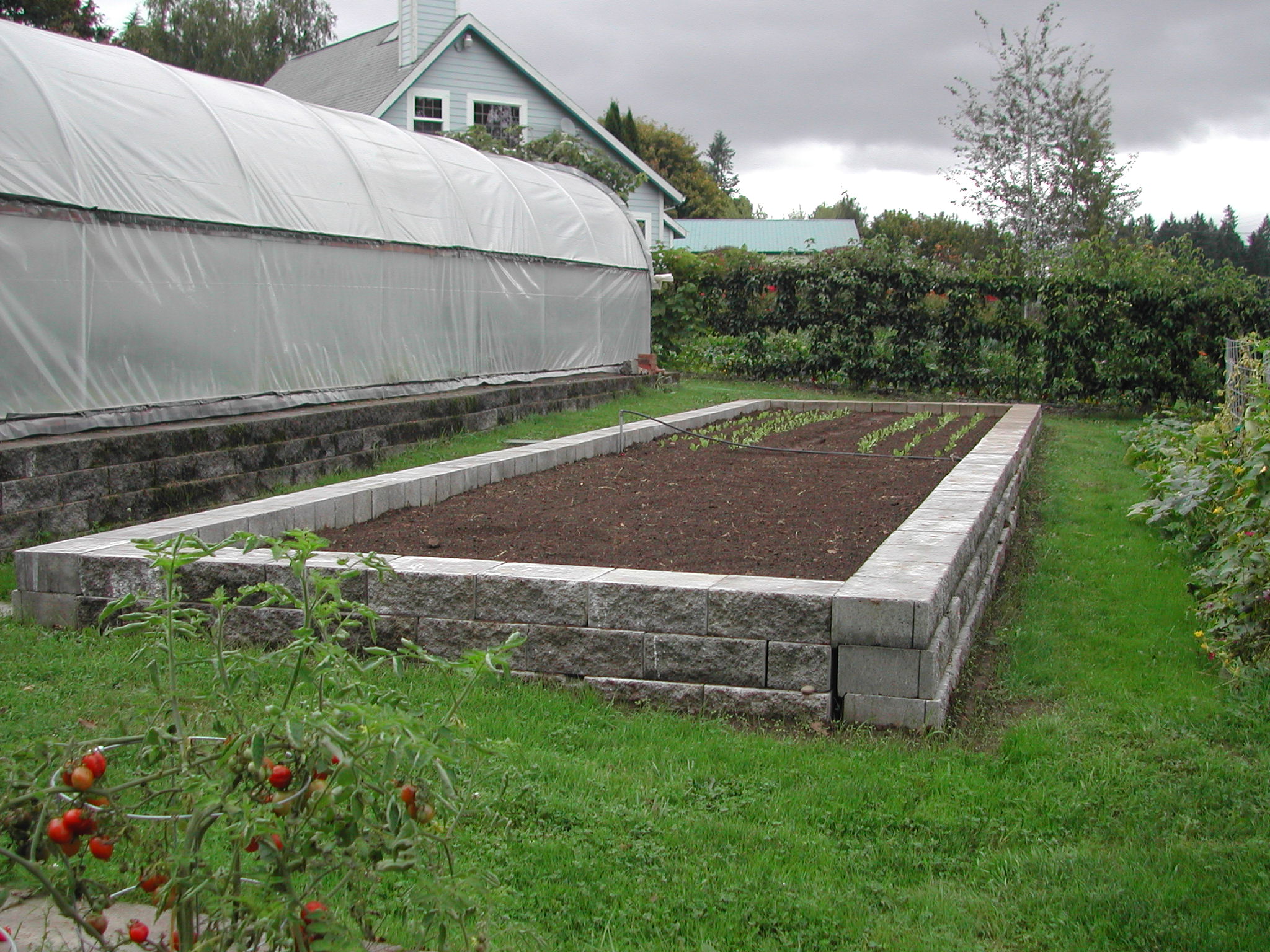 The blocked in bed. I get these crazy ideas sometimes and for some reason, Steven gives in and goes along with me. This one started a few years after we moved here, when I thought, what if we enclosed our vegetables beds with concrete blocks? It would level the beds (there is a very slight slope), keep them in place (no shifting from year to year, leaving uneven ground in between beds to trip over), keep them of uniform size (easy for planning how much can fit in a bed and irrigation lines will fit in any bed), keep the grass from growing into the beds (I do not like grass) and we would get some of the benefits of raised beds. It was a ton of work and a bunch of money, but I loved it. We built one bed each year for three years. The next year we started one, but didn’t finish. It sat unfinished for two years and then Steven completed it this summer. Another blocked in bed is ready. I have already planted half of it with fall chicories (hopefully they will grow to full size by November). The other half will be planted with cover crop. I still love it.