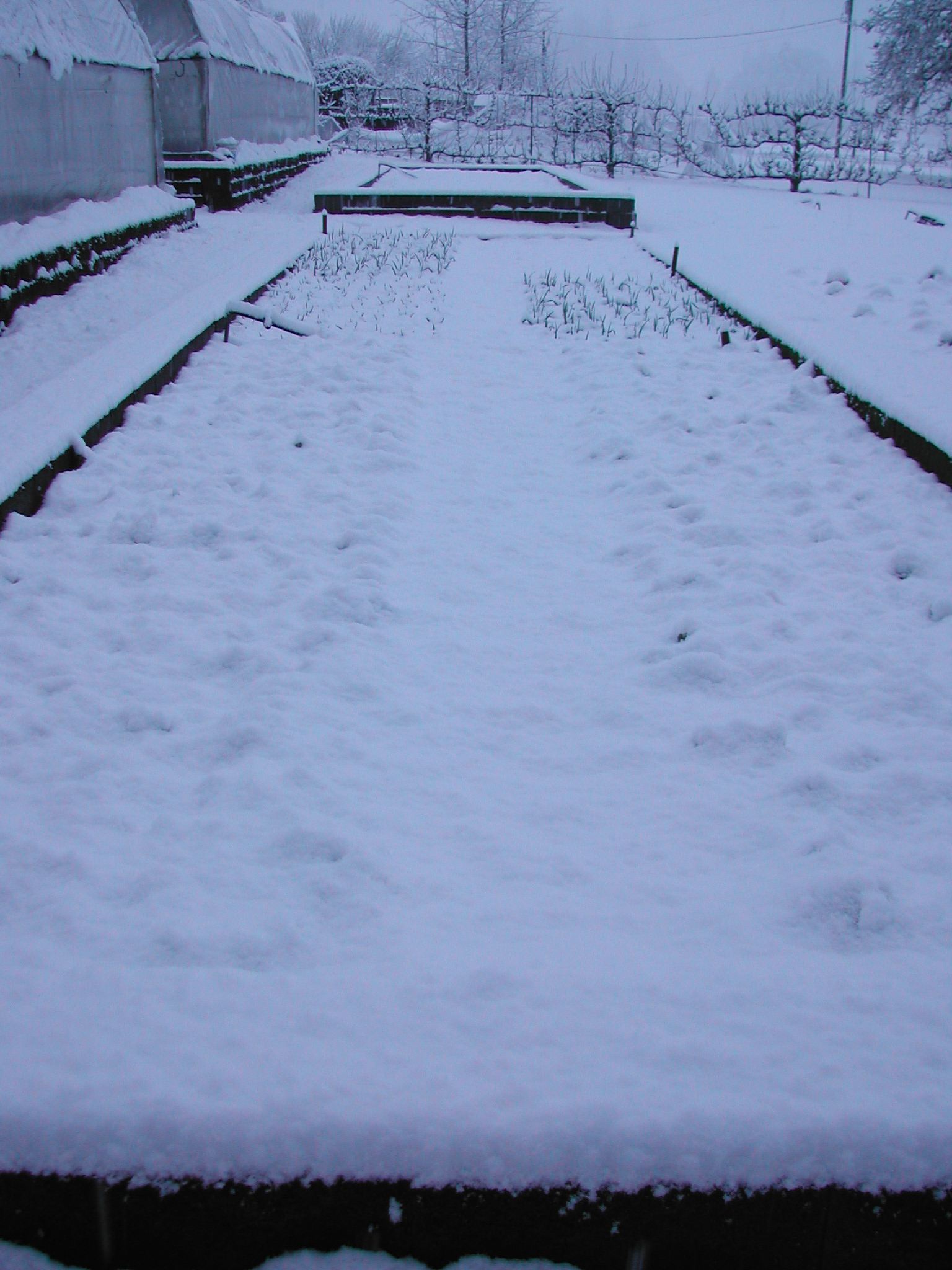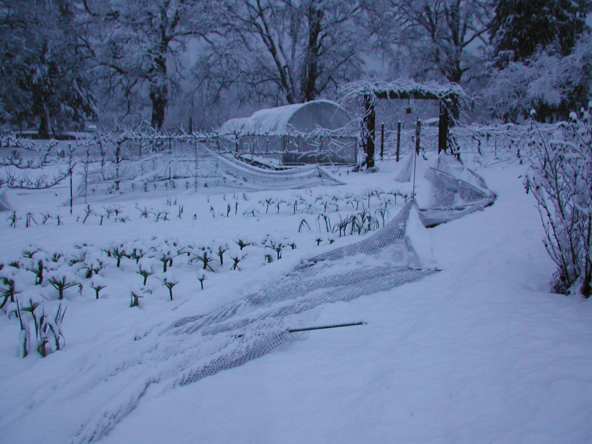 The rain that I watched turn slushy last Wednesday did eventually turn into snow. It just took a bit longer than the meteorologists thought. The snow was falling by Wednesday night and Thursday morning, we woke up to a couple inches. I ran out quickly to shake the snow off the chicken fence netting, so the poles wouldn’t bend or break under the weight. Next I swept the snow off the hoop houses. There wasn’t really enough to be a problem, but why take the risk? I have heard the stories of collapsed hoop houses. By the time I got back from taking Steven to catch a bus into work, it was starting to melt. I was kind of late on the pictures again, but not as late as last week.