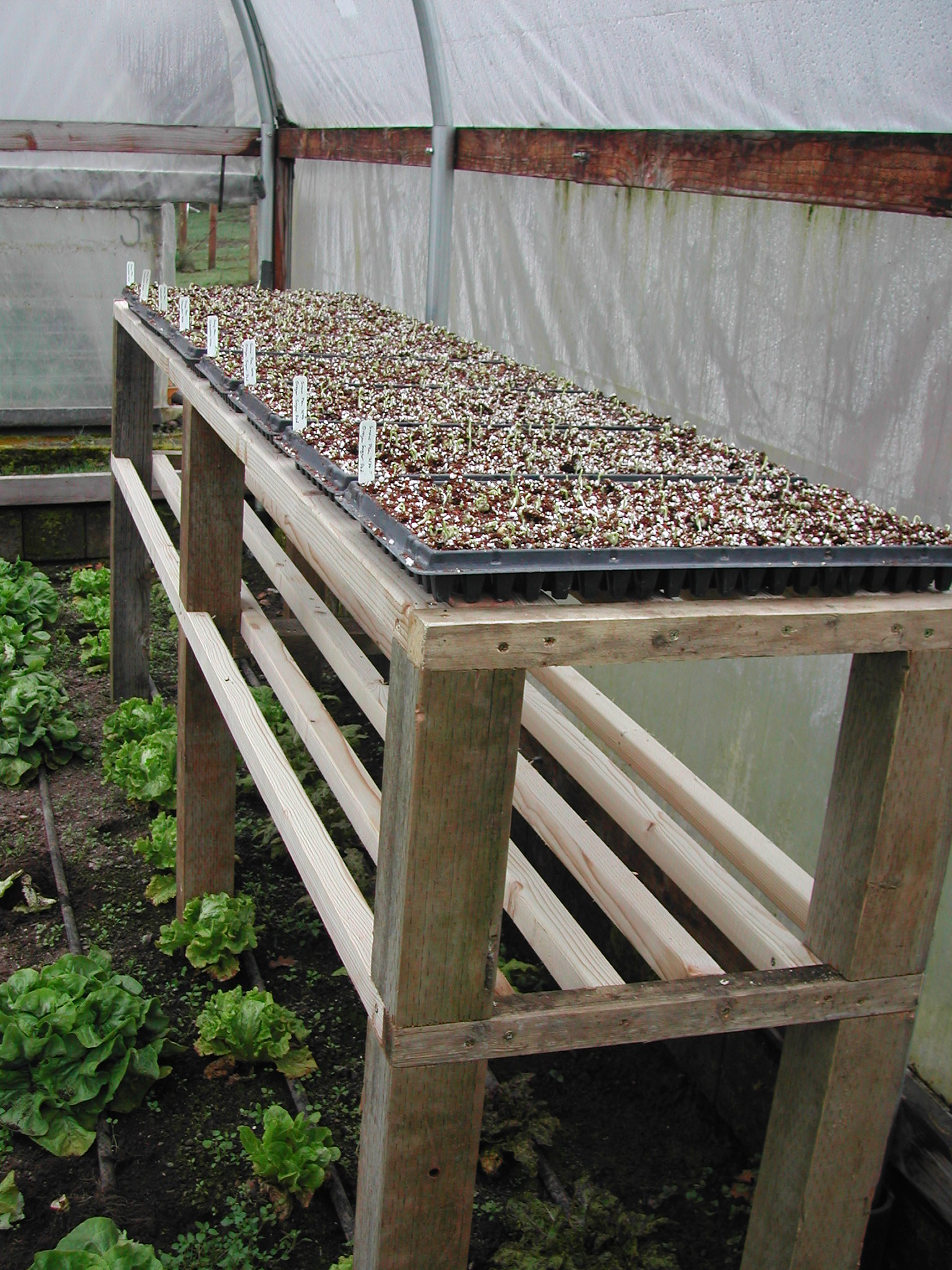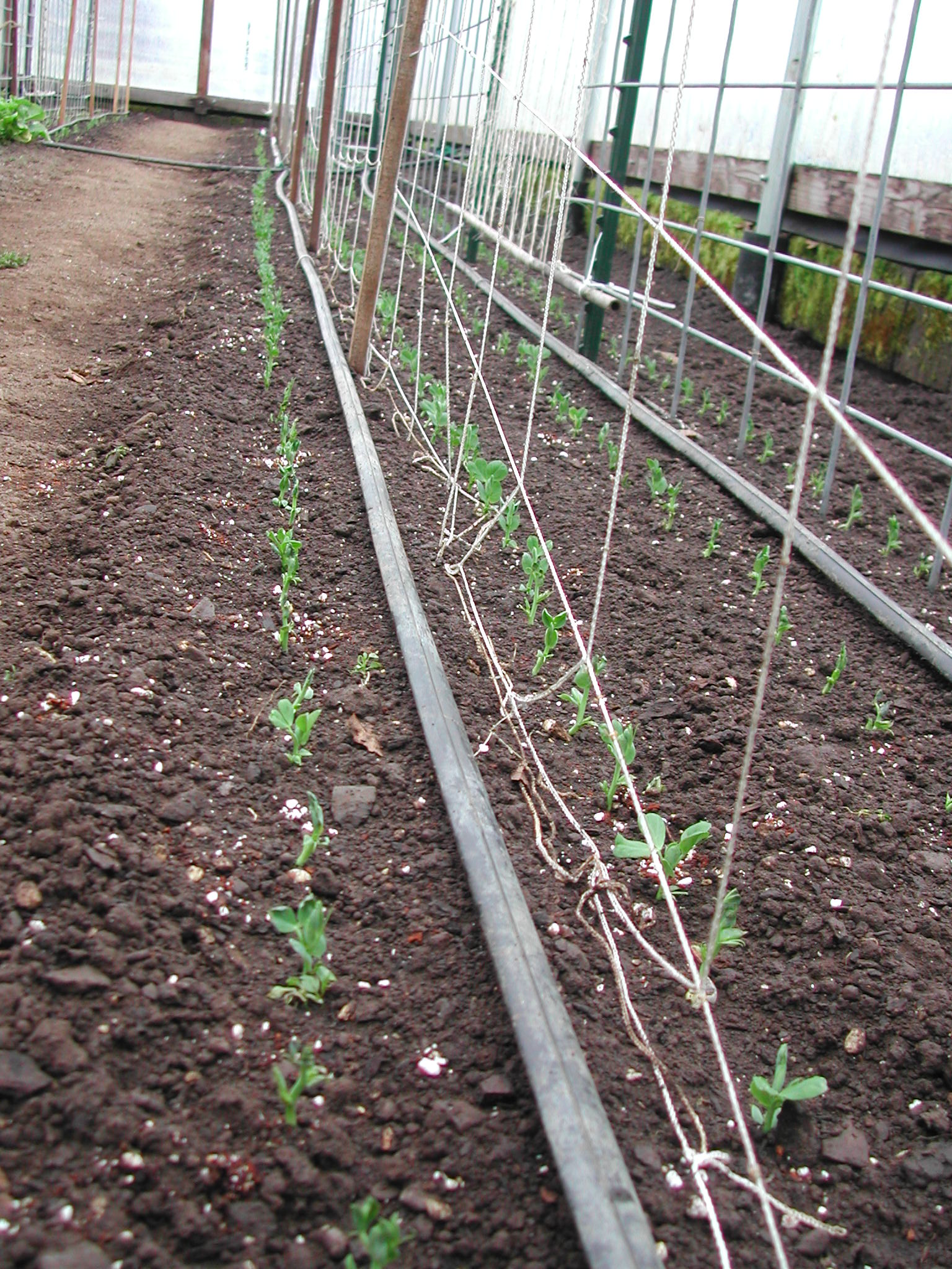 Inside, there is another story. Flats are filling up the basement. A few weeks ago, Steven made a table for flats to put out in the hoop house. Over last weekend, we got the hoop house beds ready to plant and the first batch of peas went in. In my mind, this is another plus for hoop houses: not only a temperature buffer, but a rain buffer. Sure, the edges are wet, but overall the ground is dry enough to work up and plant. I’ll keep starting the seeds and potting up, if needed, until it is dry enough to get the beds outside ready to plant.