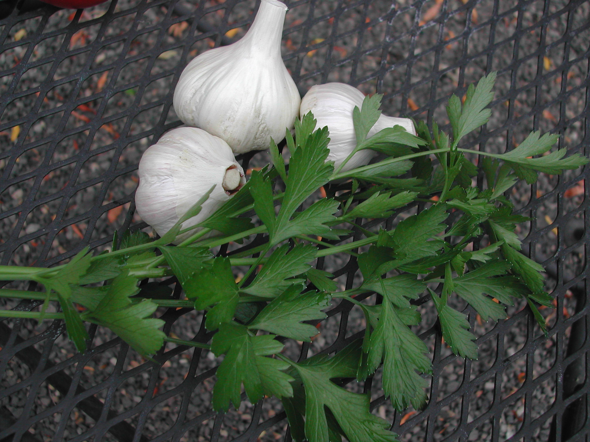 Crush the garlic with salt, add cumin, vinegar, parsley and oil. Slice the tomatoes about 1/2 thick. Dip in the garlic mixture and arrange in a serving dish. Or make a vertical cross-incision in small tomatoes, leaving the base intact, stuff with the garlic mixture and arrange in a serving dish. Or you can do what we usually do and just chop the tomatoes into chunks and mix with the garlic mixture. This is vibrant!