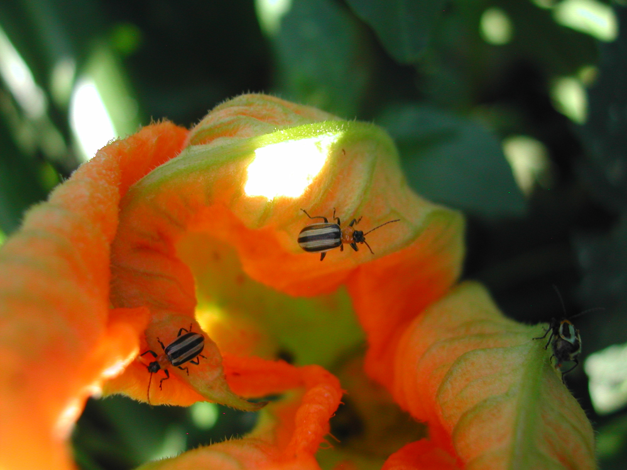 The cucumber harvest also brings us to the cucumber beetle. Most of my experience with cucumber beetle has been with the Western spotted cucumber beetle eating my greens (mostly chard and lettuce). Though they did enough damage, I didn’t find them in huge numbers, usually one or two at a time. That experience is expanding to include the Western striped cucumber beetle this summer. I see them in the cucumbers and summer squash mostly, but other places, too. They are faster and fly more than the spotted beetle, so they are harder to catch and squish.