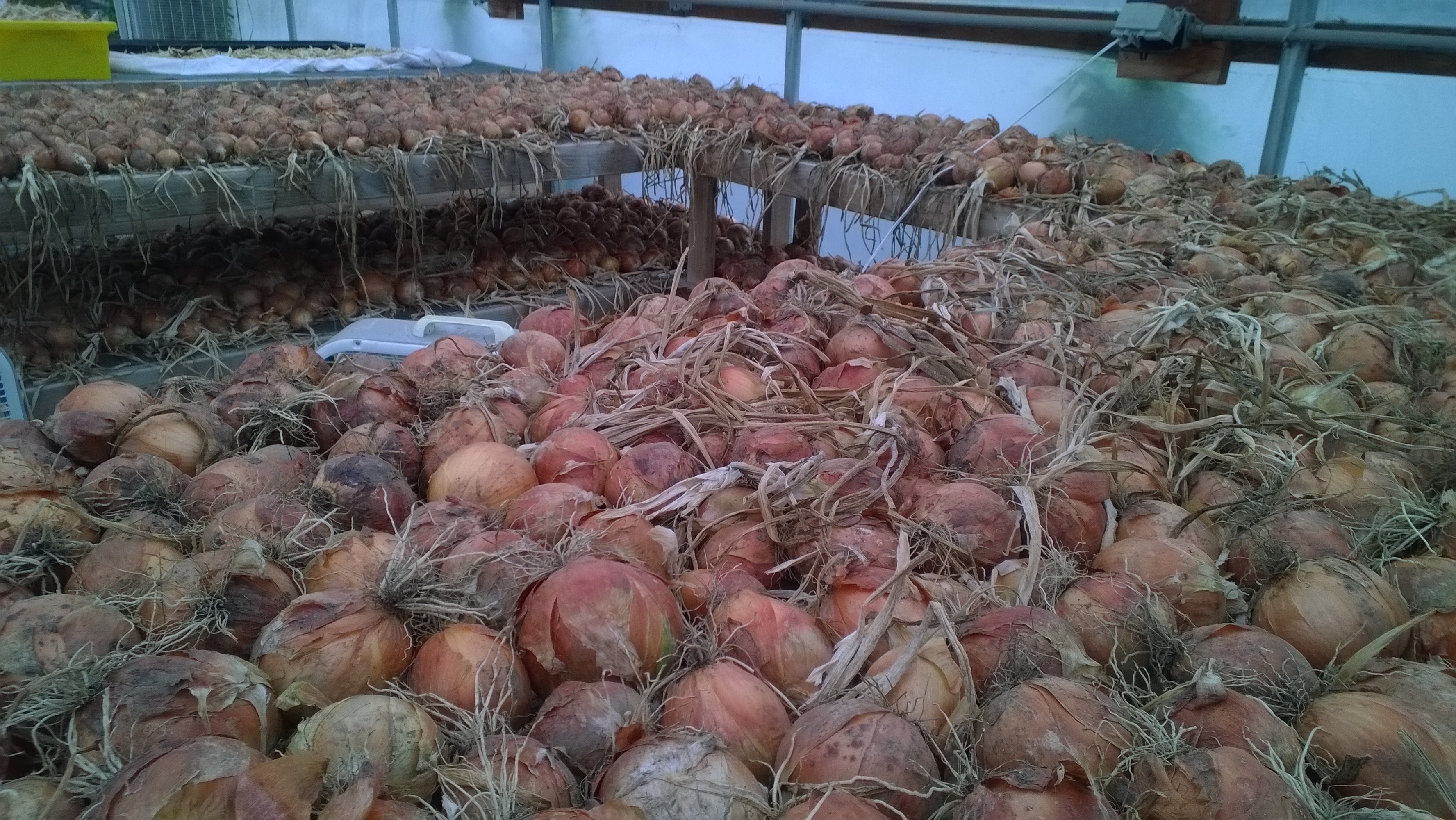 First up was onions. (Garlic was really the first one, but that happened in July, so I don’t count it here.) We started a bit late, the second week of September, with pulling the remaining Walla Walla sweet onions out of the field. The next week, we tackled our New York Early yellow storage onions. Finally, this week, we finished off with the Rosa di Milano red storage onions and Ed’s Red Shallots. They are all safely in the hoop house, finishing curing/drying down for winter storage. This has been a great onions year for us, with our biggest harvest ever. We dug up more than 850 lbs of New York Early onions alone. I think we’ll have enough for the winter.