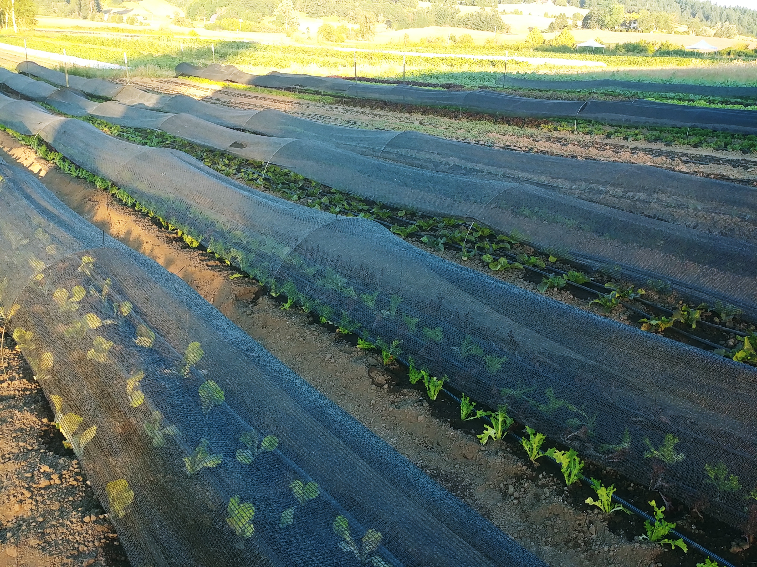We’ll help the plants get through the heat as much as we can. We made some preparations on Friday, covering lettuce with shade cloth (pictured above) and throwing a mud slurry on one of the hoop houses, to provide some shade. I expect to spend a lot of time these next few days keeping everything hydrated. Other than that, we will hope for the best.
