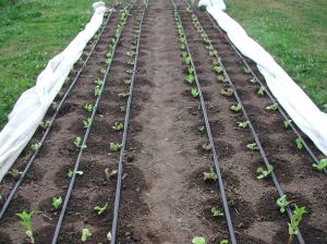 Other things can cause gaps in the lettuce, too, like poor germination. That happened in a planting from three weeks ago, which means there will be less lettuce in October. Conditions in the field can make or break a planting. In the spring, there are slugs, later there are butterfly and moth larvae or aphids that can damage the heads. Sometimes it is just the weather. If it is too hot, the heads may bolt prematurely. And of course, there are deer. Now I am covering all the lettuce beds at night. Once in a while I can see where the deer have walked across the covered beds. So far, they haven’t stepped on and crushed any lettuce.